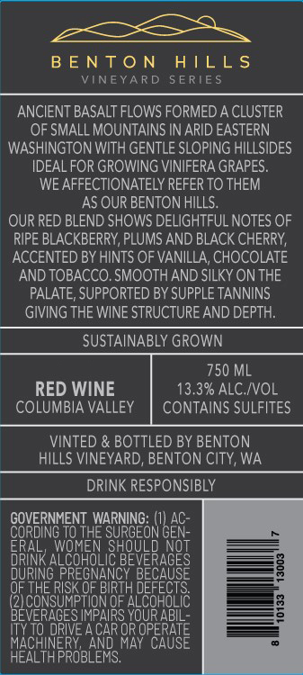 Benton Hills Red Wine blends fruit from our premier blocks, showcasing the tremendous range of red wine styles Washington and Goose Gap can produce. Each wine was vinified separately to manage fermentation to create the optimal balance of structure, freshness, and richness in the wine. Malolactic fermentation was completed on oak to enhance softness and sweetness. The wine matured for 12 months before bottling.