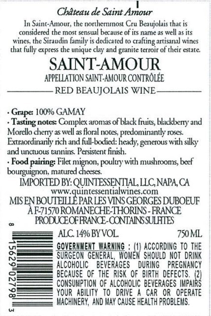 Saint-Amour is the northernmost Beaujolais Cru, and the smallest. The “romance” of wine is especially pronounced in this region by virtue of its name. The Siraudin family owns the Estate.