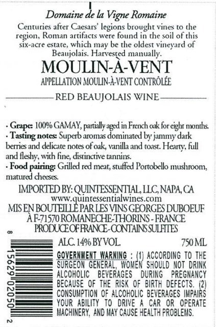 Georges Duboeuf Domaine de La Vigne Romaine Moulin-Á-Vent – Back Label – Non-Vintage