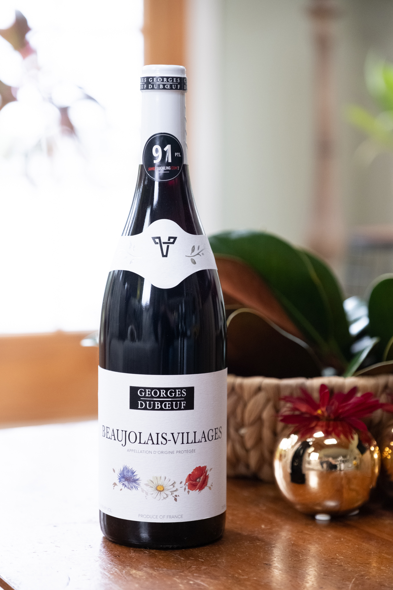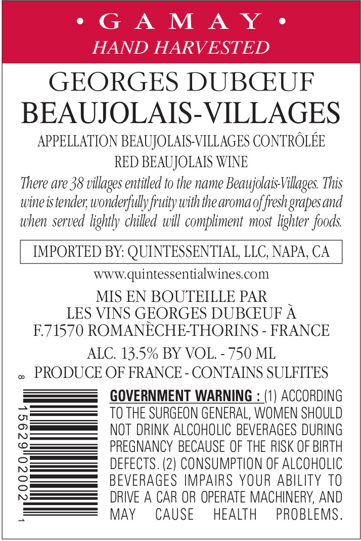 This Beaujolais-Village flashes a brilliant garnet color as it displays incomparable fruitiness in the purest expression of Gamay. Intense aromas of black fruits and fragrances of crème de cassis start in the nose and quickly moves down to the full-bodied, round and vinous palate, that benefits from delicate tannins.