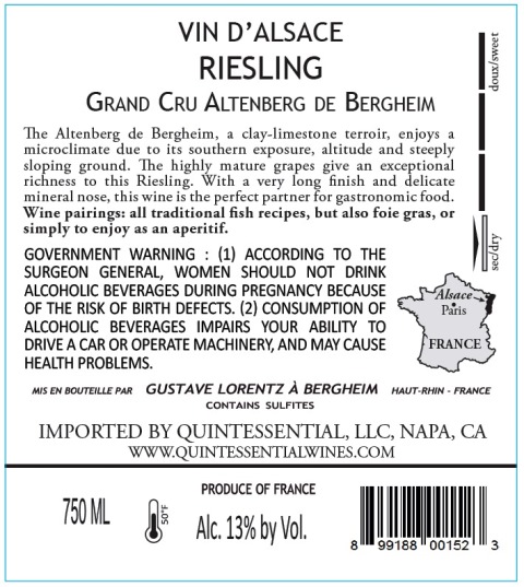 This wine is produced from 100 % Riesling grapes from the classified Grand Cru site of the Altenberg of Bergheim vineyard owned by Gustave Lorentz. The dominant soil of this area is clay and limestone; the vines from which this wine is produced are very old, between 30-50-years-old. The pride of Bergheim winegrowers, the Altenberg has been renowned for its fine wines since the end of 13th century. Altenberg Grand Cru wines are remarkable for the perfect balance between their subtle, distinguished aroma and their powerful body.