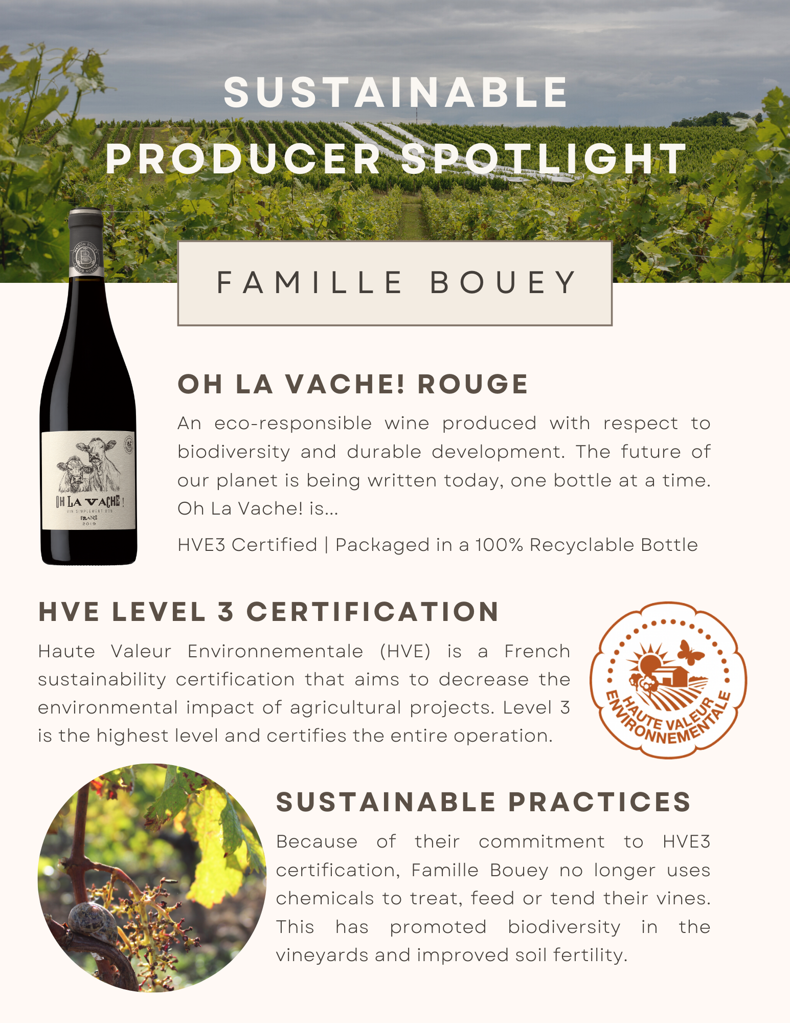Bordeaux winemakers since 1821, the Famille Bouey are very proud of the eco-responsible “Oh La Vache!” wine, that is produced with the utmost respect to biodiversity. Certified High Environment Value (HEV) Level 3, the wine is bottled in recycled and refined glass, its label is produced from cane sugar fibres, and its cork comes from sustainable forests. This wine is made to be enjoyed…and then returned to the terroir.