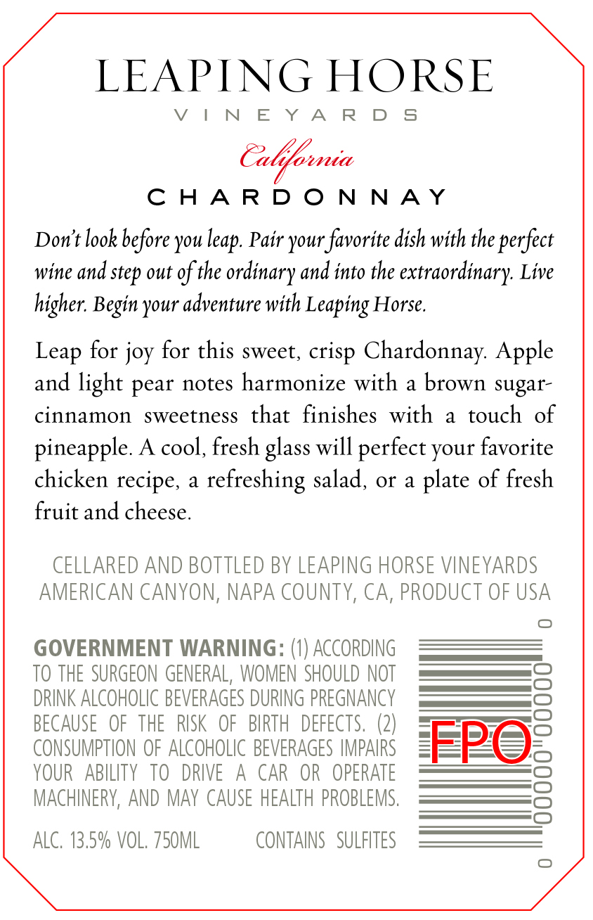 Medium bodied with a delightful pale-yellow hue, the 2022 Leaping Horse Vineyards Chardonnay is bright and crisp from start to finish. It has citrus highlights to green apples, pears and tropical fruit aromas and flavors. The finish hints to a bit of lemon zest and a tight minerality that is enjoyable and refreshing.