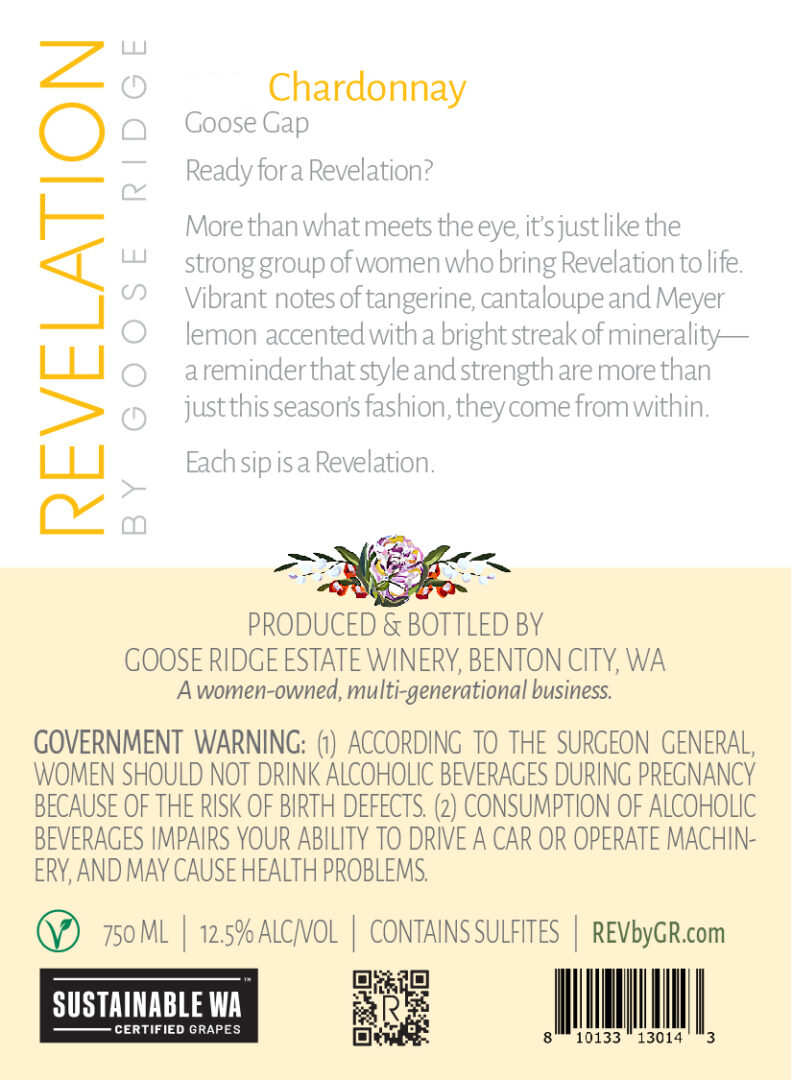 The Revelation Chardonnay balances several styles of Chardonnay together into one cohesive wine that primarily expresses bright and fresh citrus minerality. Half of the wine was fermented cool in stainless steel tanks with no malolactic fermentation. A third was fermented in stainless steel with French oak staves and completed malolactic fermentation. A fifth of the blend was fermented in neutral and once-filled French oak barrels. The blended wine aged for three months on lees before filtration and bottling.