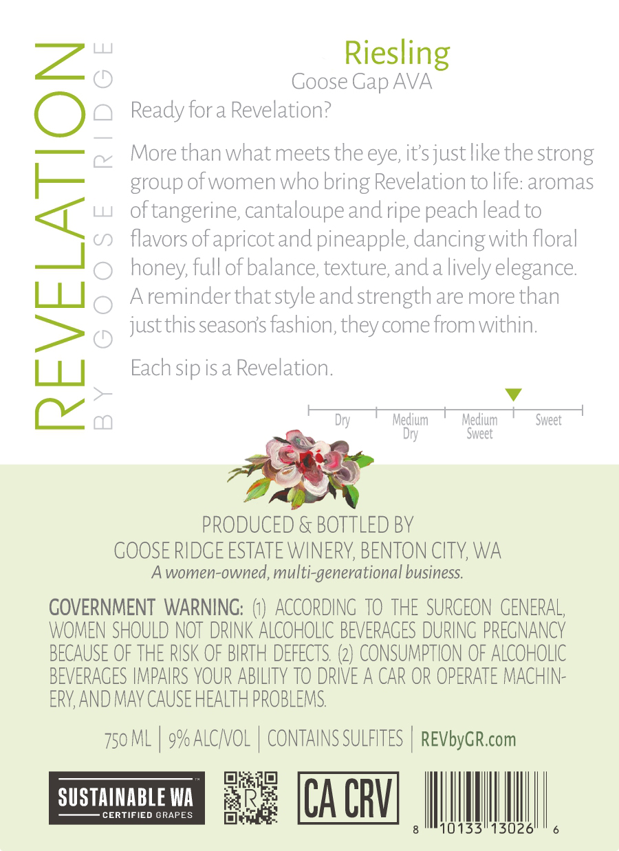 The 2023 Revelation Riesling shows beautiful aromatic notes of pear, melon, and lavender layered into a fragrant perfume. The rich, nectarous texture complements flavors of juicy ripe stone fruits and pears, offering a delightful balance of sweetness and acidity.